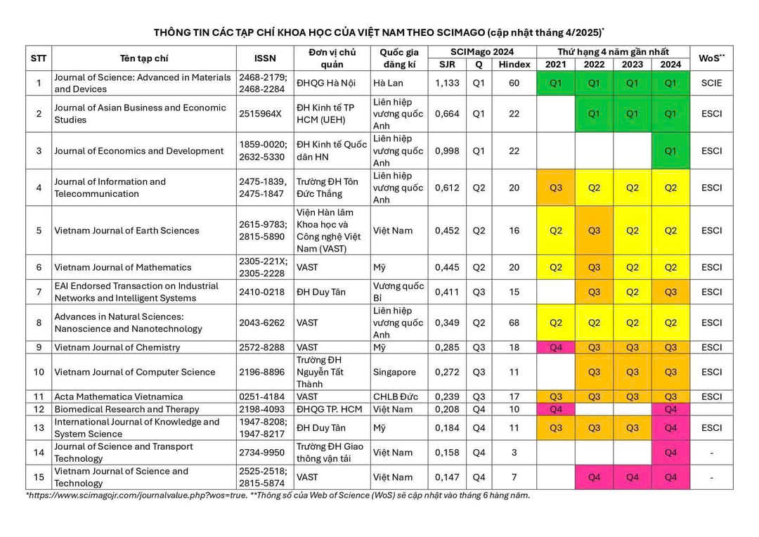 Hiện nay, số lượng các tạp chí khoa học của Việt Nam đạt chuẩn quốc tế còn rất hạn chế, tính đến tháng 04/2025, Việt Nam có 15 tạp chí trong cơ sở dữ liệu của Web of Science (WoS) và Scopus. Mặc dù phần lớn các tạp chí đã xây dựng được hội đồng biên tập (chiếm 89,5%), nhưng thành viên hội đồng biên tập là các nhà khoa học trong nước vẫn chiếm đa số (gần 2/3). Các tạp chí khoa học hiện nay không kiểm tra sự trùng lặp của bài báo (62,8%)1. Phần lớn các tạp chí khoa học hiện nay không kiểm tra sự trùng lặp của bài báo (62,8%); có 25,7% số các tạp chí khoa học chưa xây dựng website2...