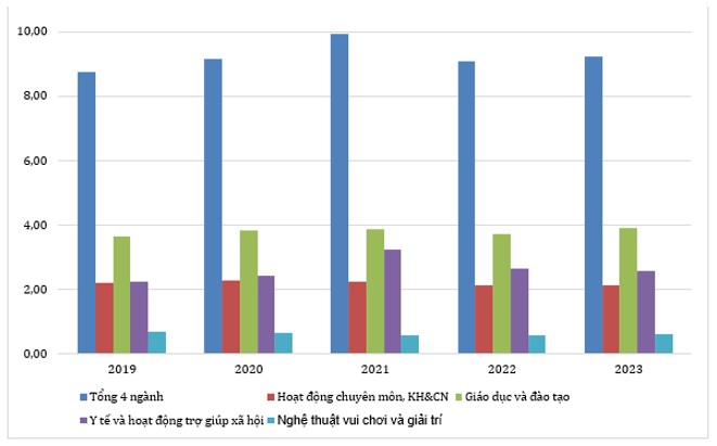 Từ 2019 đến 2023, ngành dịch vụ tăng trưởng ổn định với tốc độ dao động từ 102,55 (2021) đến 108,54% (2022), cho thấy nền kinh tế dịch vụ đang dần phục hồi sau đại dịch COVID-19. Ngành KH&CN giữ mức tăng trưởng đều từ 104,80 đến 106,26%, giáo dục đạt 105,68% (2022) và 104,88% (2023), phản ánh nỗ lực duy trì chất lượng và chuyển đổi số. Ngành y tế có biến động mạnh, tăng vọt lên 141,01% năm 2021 do phòng chống dịch, giảm xuống 92,38% (2022) và phục hồi nhẹ vào năm 2023. Ngành nghệ thuật và giải trí giảm xuống còn 91,23% (2021), nhưng phục hồi nhanh với mức trên 112% vào năm 2023 (hình 2). Sự phục hồi không đồng đều giữa các ngành DVSNC đòi hỏi Nhà nước tăng cường vai trò điều tiết để duy trì chất lượng và hiệu quả trong bối cảnh còn nhiều biến động.