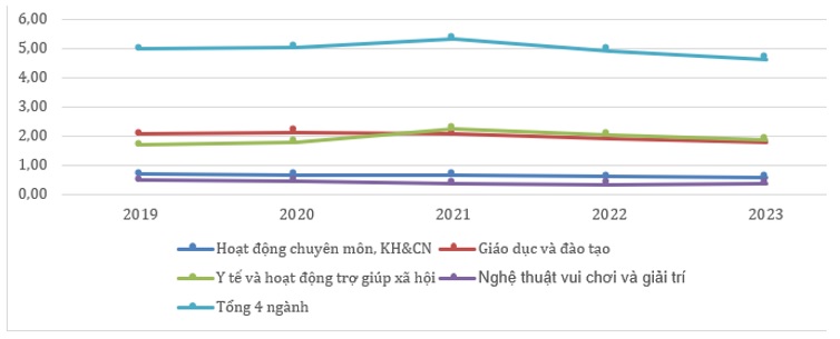 Tỉnh Quảng Ninh ghi nhận sự phát triển ổn định của các ngành DVSNC với mức tăng trưởng trung bình trên 105% mỗi năm. Tỷ trọng đầu tư vào hoạt động chuyên môn, KH&CN giảm nhẹ từ 0,69% (2019) xuống 0,57% (2023) và vẫn thấp nhất trong 4 ngành cần được tăng cường để nâng cao hiệu quả dịch vụ. Giáo dục chiếm tỷ trọng lớn nhất nhưng giảm từ 2,14% (2020) xuống 1,78% (2023), với chỉ số tăng trưởng duy trì ổn định quanh 104-106%. Y tế tăng mạnh từ 2,24% (2021) - giai đoạn cao điểm dịch COVID-19 - rồi giảm về 1,89% (2023) cho thấy vai trò thiết yếu trong chăm sóc sức khỏe cộng đồng. Nghệ thuật - giải trí chịu ảnh hưởng nặng với tỷ trọng giảm từ 0,48 (2019) xuống 0,35% (2022), nhưng đã phục hồi lên 0,39% (2023) cùng chỉ số tăng trưởng đạt 116,26%, mở ra cơ hội phát triển gắn với du lịch và văn hóa địa phương.