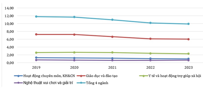 Từ năm 2019 đến 2023, tỷ trọng đóng góp vào GDP của bốn lĩnh vực DVSNC tại tỉnh Kon Tum đều có xu hướng giảm. Cụ thể, hoạt động chuyên môn cùng KH&CN giảm từ 1,28 xuống 0,99%, cho thấy sự thiếu hụt đầu tư và chưa khai thác được vai trò thúc đẩy tăng trưởng kinh tế. Giáo dục và đào tạo, dù chiếm tỷ trọng cao nhất nhưng cũng giảm mạnh từ 7,22 xuống 6,02%, có thể do cải cách bộ máy, xã hội hóa hoặc sự phát triển vượt trội của các ngành khác. Y tế và hoạt động trợ giúp xã hội giữ ổn định trong giai đoạn 2019-2021 nhưng giảm từ 2,59% (2022) xuống 2,28% (2023), phản ánh sự duy trì quy mô nhưng không tăng trưởng tương xứng. Trong khi đó, nghệ thuật, vui chơi và giải trí có tỷ trọng thấp, dao động quanh 0,6%, nhưng có sự hồi phục nhẹ từ 0,62 (2022) lên 0,65% (2023) cho thấy tiềm năng phát triển nếu kết hợp với du lịch và văn hóa địa phương.