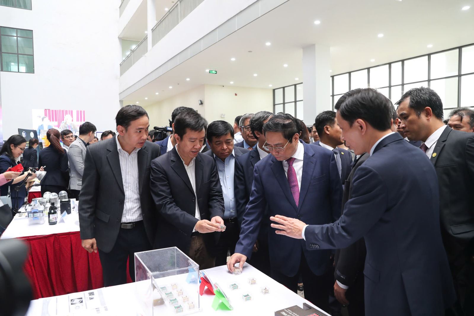 Thủ tướng Chính phủ Phạm Minh Chính nghe giới thiệu về sản phẩm chip bán dẫn của Trường Đại học Khoa học Tự nhiên, Đại học Quốc gia Hà Nội. Nguồn: VNU Medi.