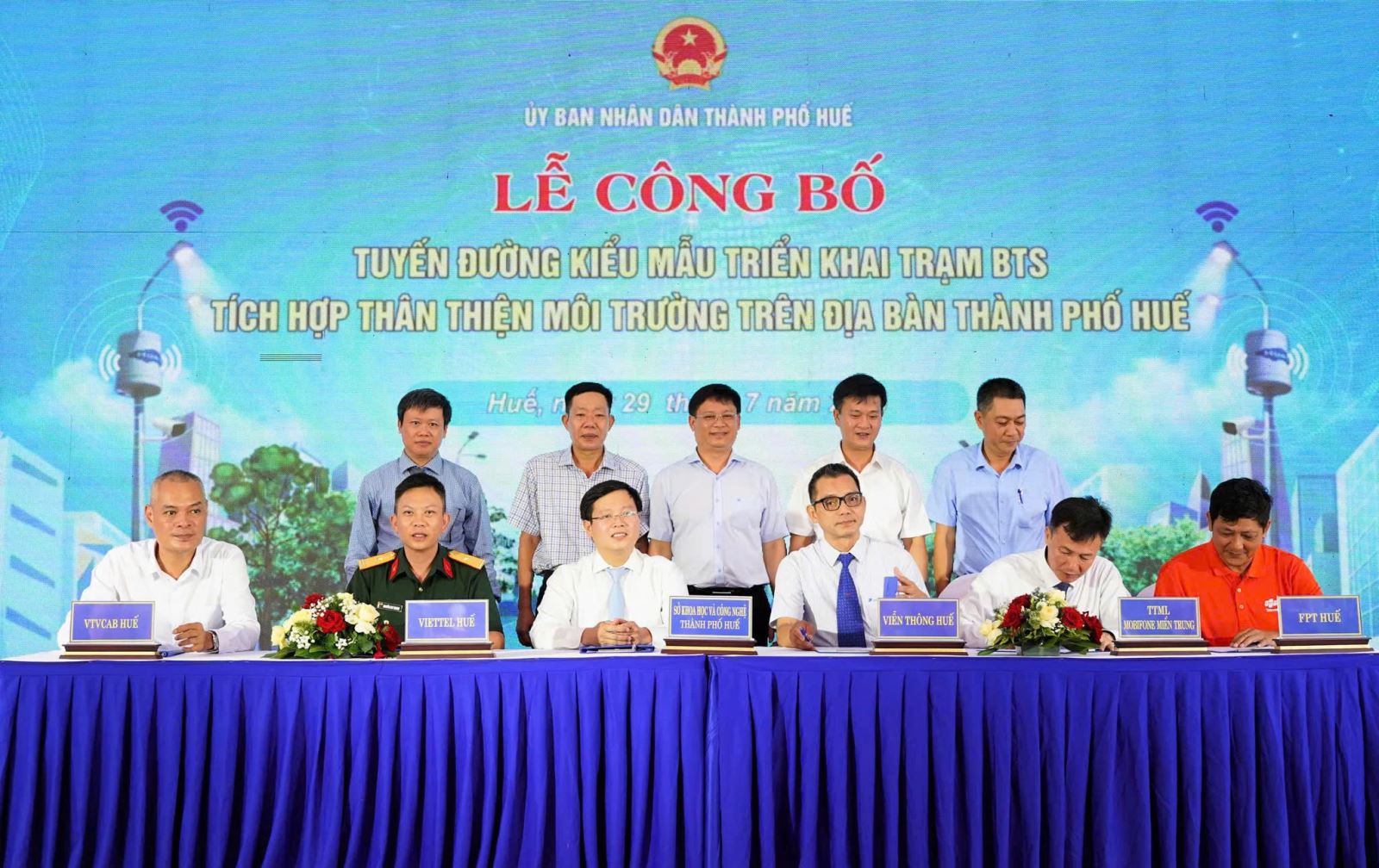 Các đại biểu thực hiện nghi thức công bố tuyến đường kiểu mẫu triển khai trạm BTS tích hợp thân thiện môi trường trên địa bàn TP Huế.